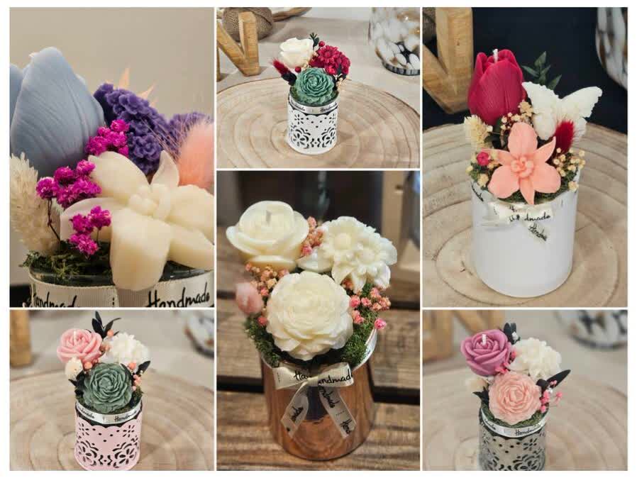 Bouquets de bougies et fondants parfumés en cire 100% végétale, sans OGM, biodégradable, vegan, non testée sur les animaux, entièrement fabriqués à la main dans mon atelier situé en Vendée.
